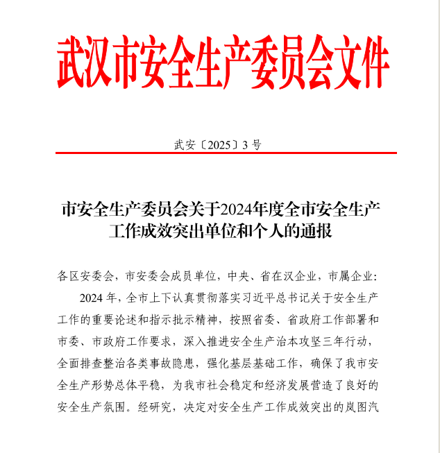 近日,武汉市安全生产委员会发布《关于2024年度全市安全生产工作成效突出单位和个人的通报》,华晟通公司荣获武汉市2024年度安全生产工作“优秀集体”称号,党总支书记、董事长凡孝均获评武汉市2024年度安全生产工作“优秀个人”荣誉。