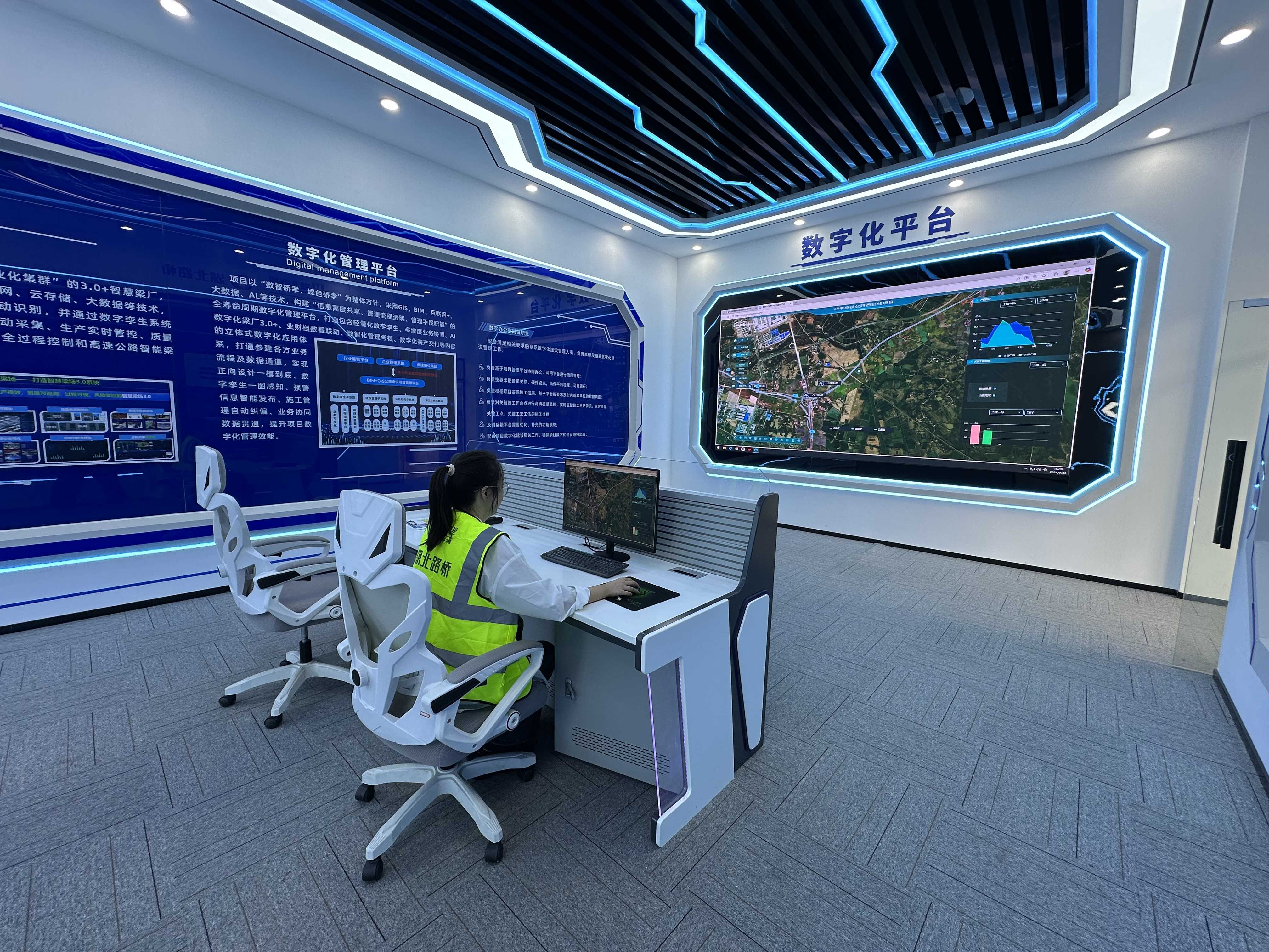 在项目部的数字化办公室,电子屏幕上,整个项目的三维BIM模型清晰可见。项目总工徐耀轻点鼠标,即可随意调取任一工点的实时画面、进度数据、质量检测报告等信息。
